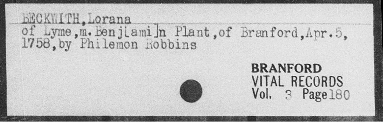 • Family History: From Beckwith Note 6, page 19. Lorana, born July 12, 1735 at Lyme; married April 5, 1758 to Benjamin Plant, of Branford.