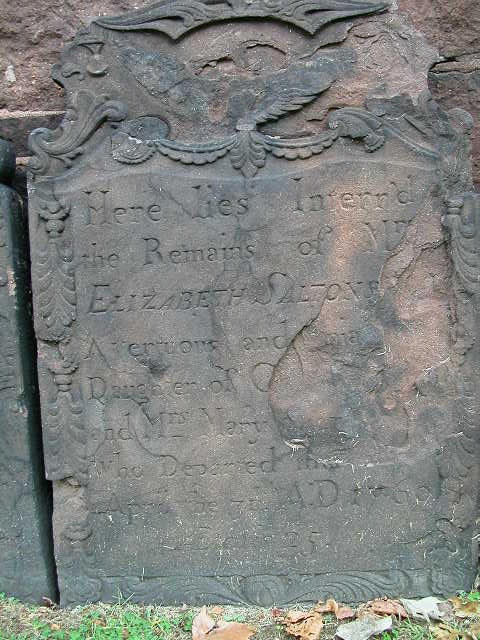 • Gravestone: From Find a Grave, Apr 1760, New Haven, New Haven, Connecticut. Elizabeth Saltonstall Birth: 1735 Death: 30 Apr 1760 (aged 24–25) Burial: Grove Street Cemetery, New Haven, New Haven County, Connecticut, USA Plot: Buried in the Green --tombstone along the Wall of the Grove St. Cemetery. Memorial #: 8705281 Inscription: Here Lies Interred the remains of Mrs. Elizabeth Saltons[tall] a virtuous and _____ daughter of [Capt. Roswall &] Mrs. Mary _______ who departed this life April the 30th AD 1760 AEtatis 25.